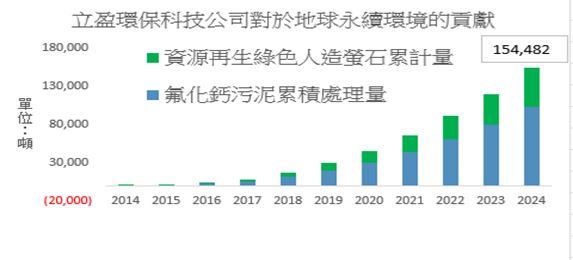 本公司從2013年設立以來到2024年所累計處理的氟化污泥及產製出的資源再生綠色人造螢石量已達154,482噸,將廢棄物重新賦予新價值,透過本公司的循環經濟解決方案,降低這些資源被不當的對待,對於地球永續環境貢獻154,482噸。