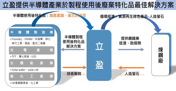 本公司秉持「環境永續發展」之企業責任「只有放錯地方的資源,沒有真正的廢棄物」的理念,協助半導體等等產業於製程中所使用後的廢氫氟酸及氟化鈣污泥,透過立盈環保科技公司的循環經濟解決方案再利用為資源再生綠色人造螢石。
