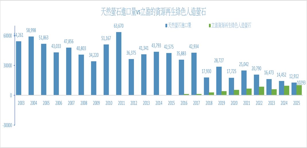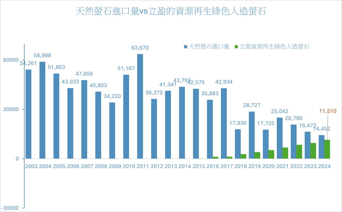 從2003年以來台灣的天然螢石進口量走勢如下表,2011年最高來到63,670噸,2003-2017年平均每年進口量為45,918噸;本公司於2013年設立後,逐漸擴大產能過程,產出的資源再生綠色人造螢石也逐年擴增,於2018年開始出明顯的轉折點,天然螢石進口量降低至17,930噸,較2017年的42,934噸減少了25,004噸,2017-2024年這段期間天然螢石進口量呈現明顯的減低,主要是資源再生綠色人造螢石的產出量逐漸增加