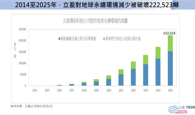 本公司從2013年設立以來到2025年所累計處理的氟化污泥及產製出的資源再生綠色人造螢石量已達222,523噸,將廢棄物重新賦予新價值,透過本公司的循環經濟解決方案,降低這些資源被不當的對待,對於地球永續環境貢獻222,523噸
